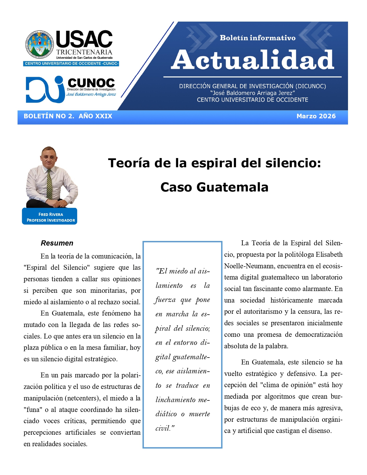 La Dirección General de Investigación CUNOC del Centro Universitario de Occidente presenta el Boletín 2, 2026 escrito por el profesor investigador Fred Rivera. Con el tema: Teoría de la Espiral del Silencio: Caso Guatemala. Un análisis del por qué muchos prefieren no opinar, ante el temor del linchamiento digital.